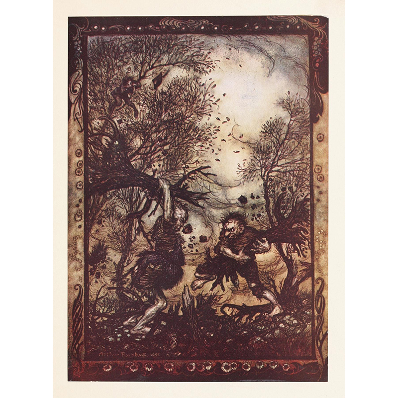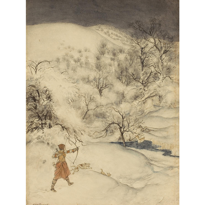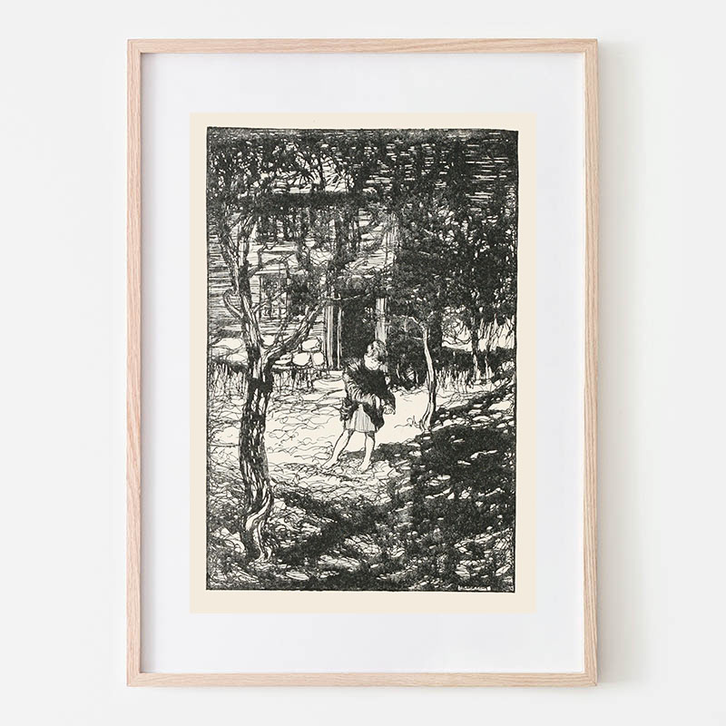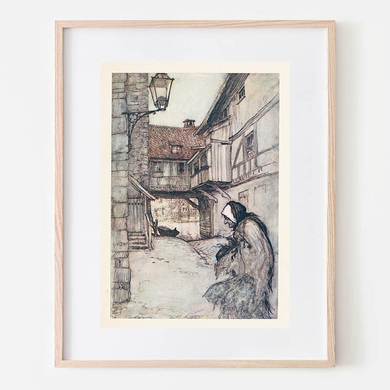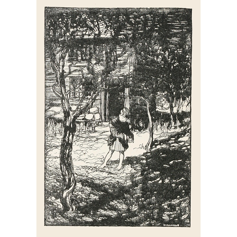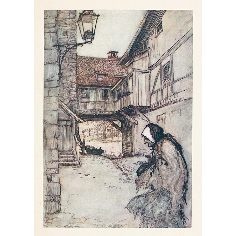 Hansel picked up the glittering white pebbles and filled his pockets with them (1920) - アーサー・ラッカム