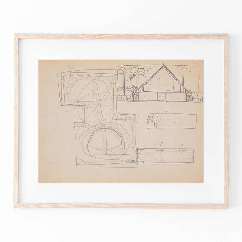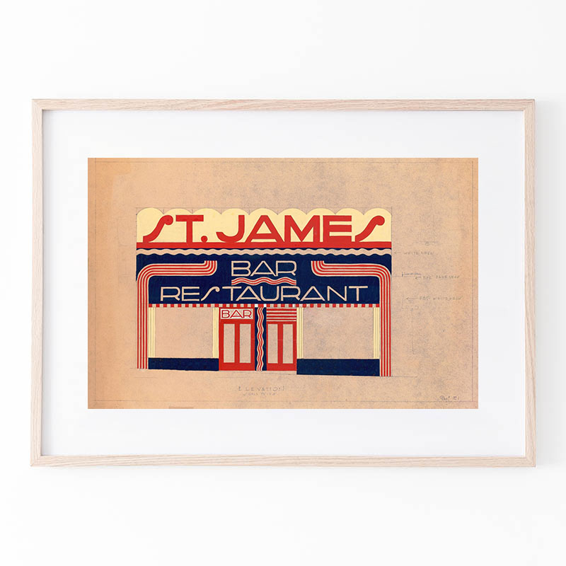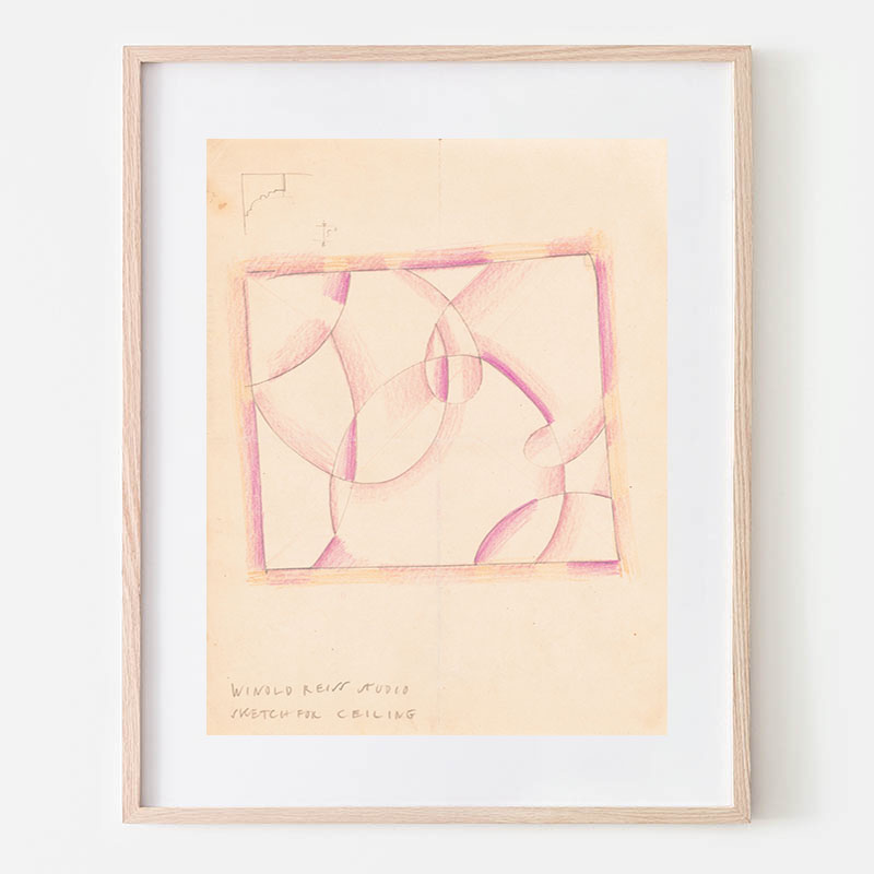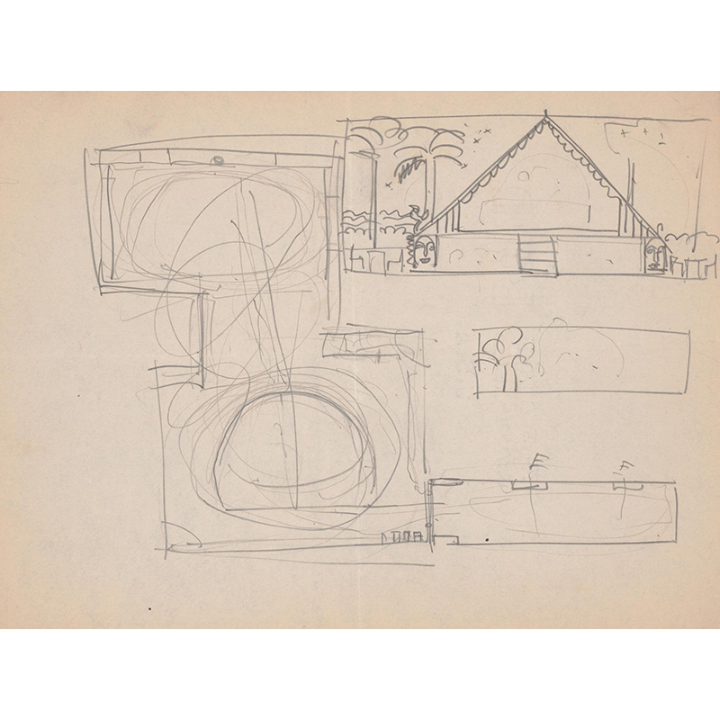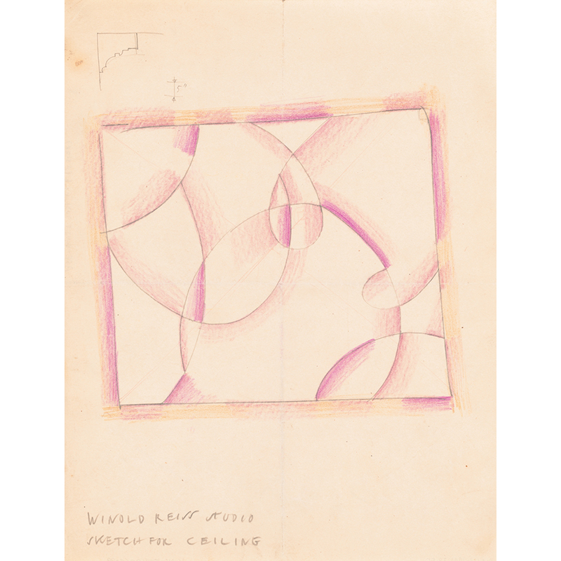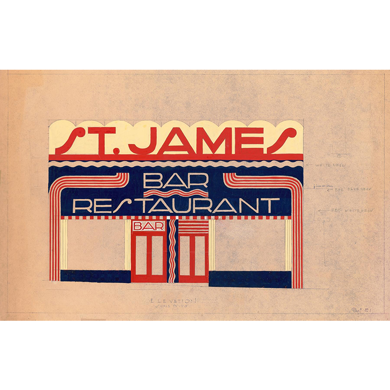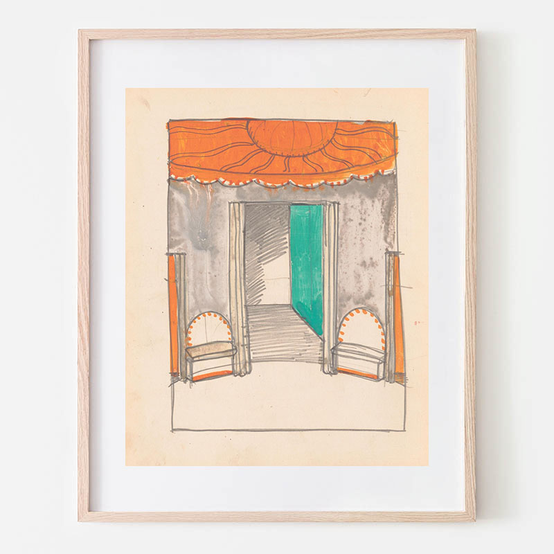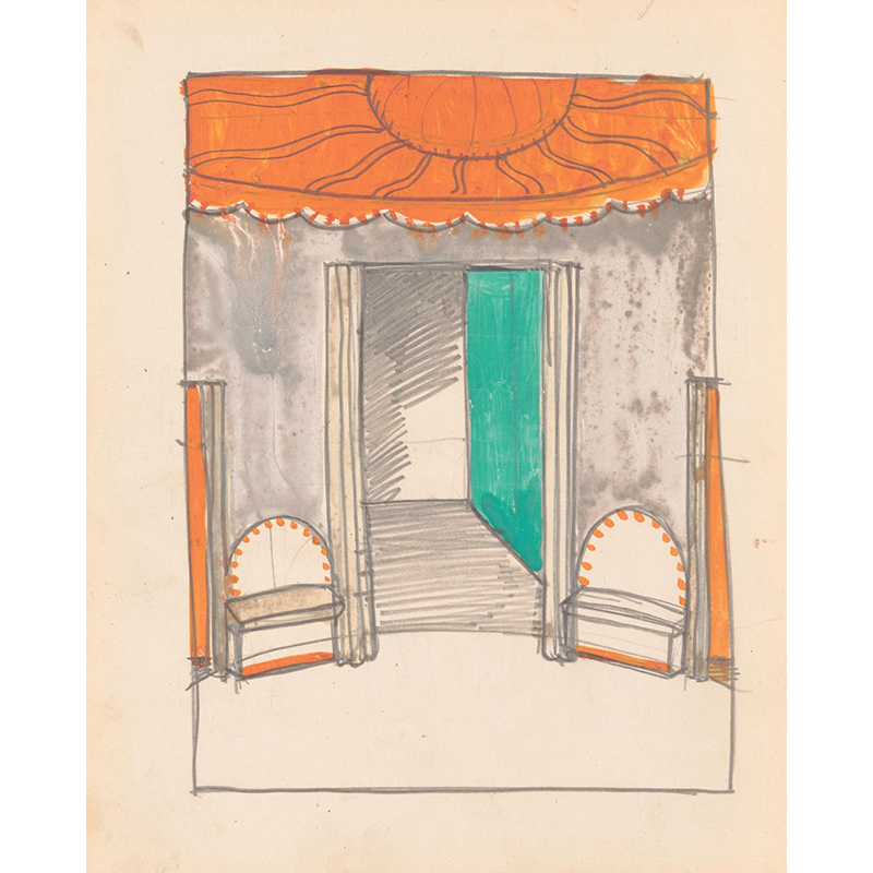 Design for unidentified building ‘Small Dining Room’.] [Drawing of dining room with benches, in black, vermillion and white, bilaterally positive and negative coloring (1910) - ウィノルド・ライス